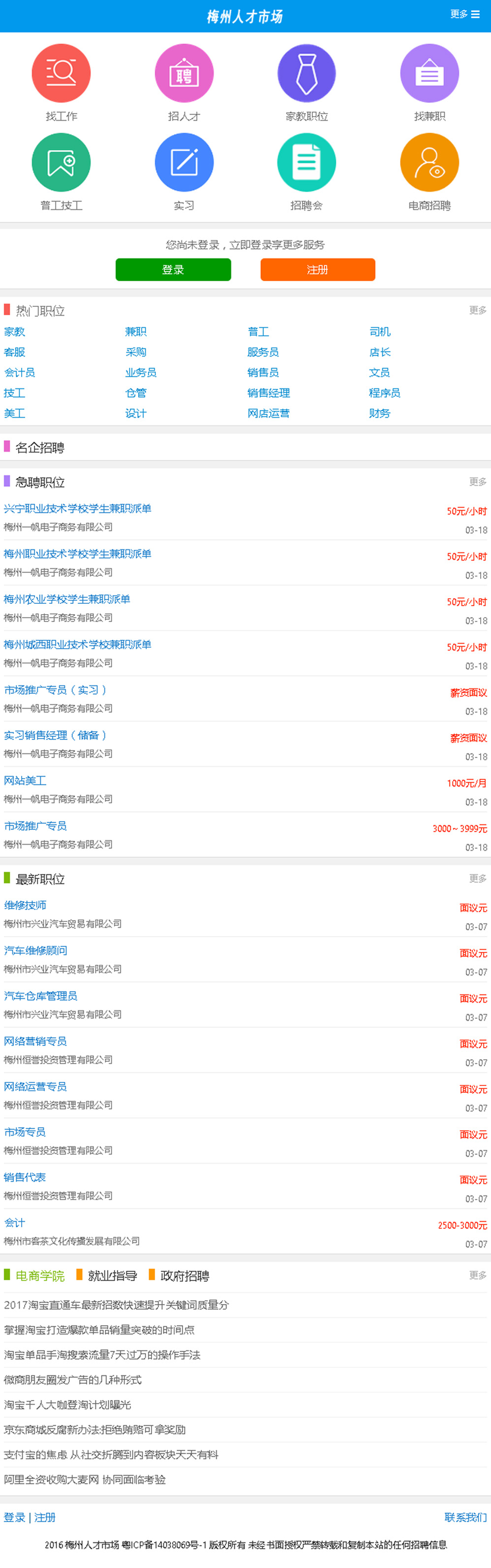 梅州人才市場www.mzjobs.cn是梅州本地服務全面、訪問量、影響力大的人才求職招聘網站,精準服務各類求職和專業人才包括家教、寒暑假工、實習、兼職、電商人才。我們憑借著雄厚的技術實力、專業的客服能力,以企業需求和用戶需求為導向,為用戶創造大的價值,為企業納才、人才求職提供高效快捷的交流平臺。梅州人才市場網同時發布了手機端、微信端、電腦端三網合一,讓你隨時隨地動動手指頭就可以找到滿意的工作和合適的人才。梅州人才市場網絡平臺已擁有超過 30萬份的求職簡歷,是梅州地區中小企業和眾多求職者的選渠道,現在業務量每月以 20% 左右的速度增長。