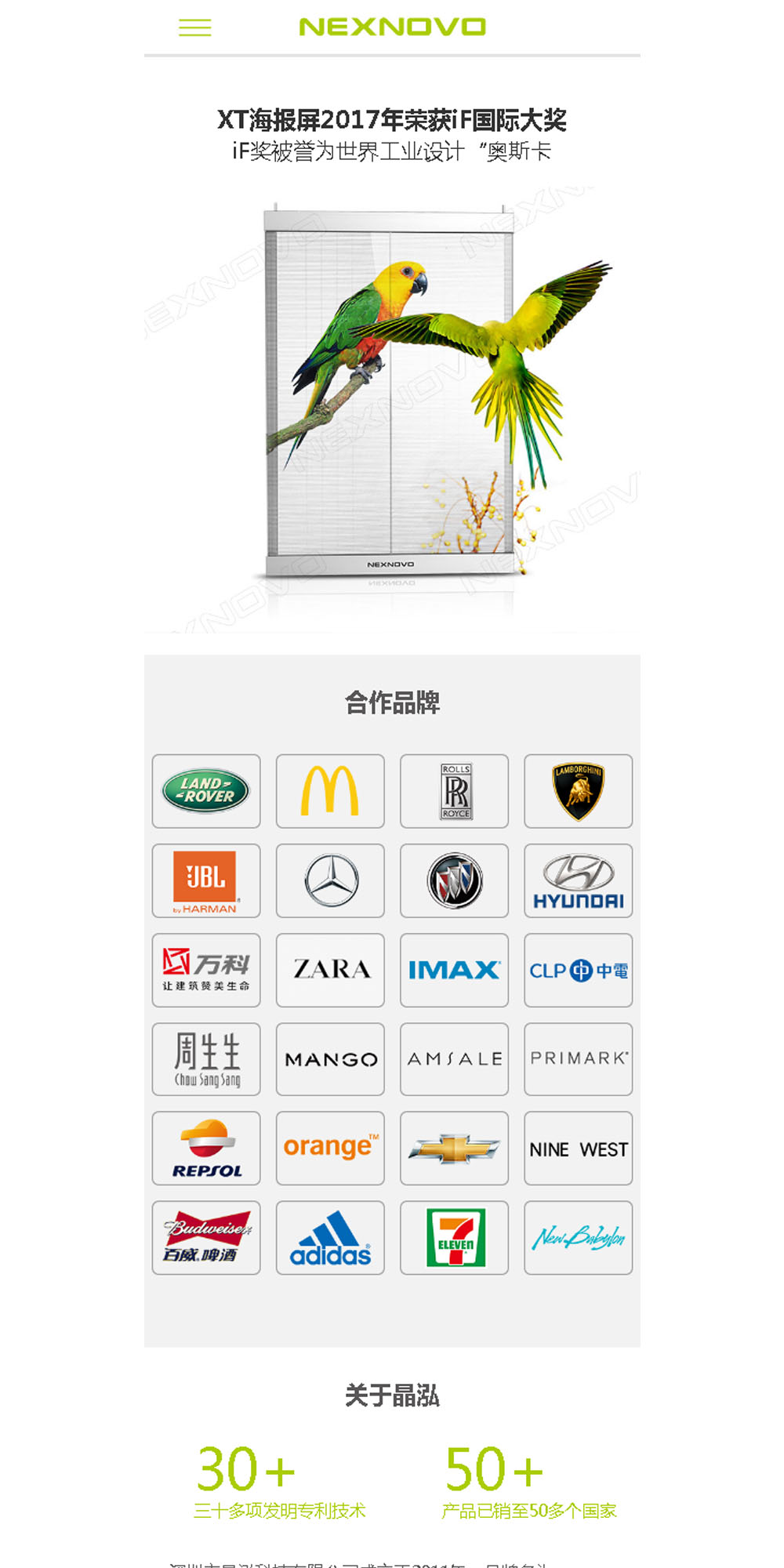 深圳市晶泓科技有限公司成立于2011年,品牌名為NEXNOVO曾用名GWS,晶泓科技是世界透明LED顯示屏的發(fā)明者和制造商,擁有30多項(xiàng)專利技術(shù).晶泓科技一直專注于透明LED顯示屏研發(fā)、生產(chǎn)和銷售。