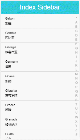 在程序代碼中,組合導(dǎo)航欄和內(nèi)容列表兩個組件,導(dǎo)航欄索引字母更新時,內(nèi)容列表跳轉(zhuǎn)到對應(yīng)的位置。